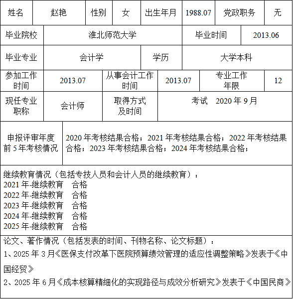 根据规定,现将本单位赵艳同志申报高级会计师资格评审有关情况予以公示,公示期10月24日至10月30日,如对以下内容有异议,请与 中医院纪委办 联系,联系电话: 0558-4688612。