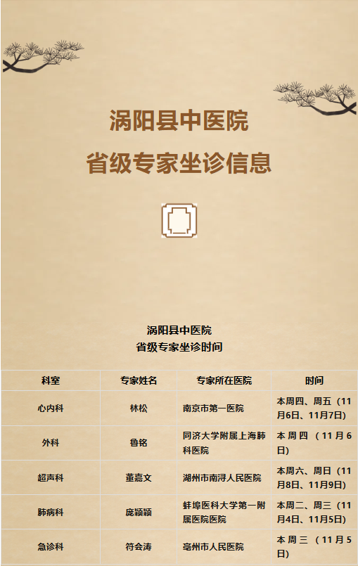 涡阳县中医院省级专家坐诊信息(附简介)【11月4日--11月16日】