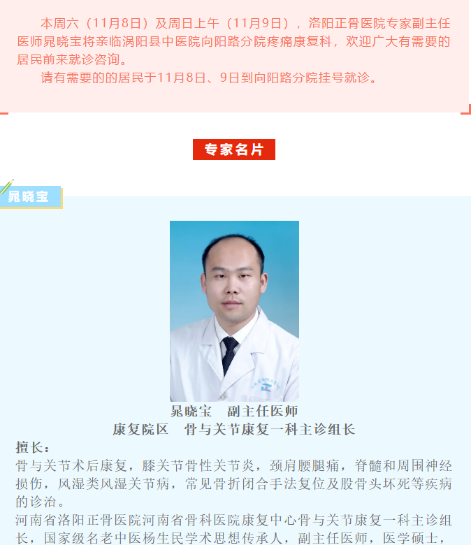 【专家来了】本周六周日洛阳正骨医院专家莅临涡阳县中医院向阳路分院疼痛康复科